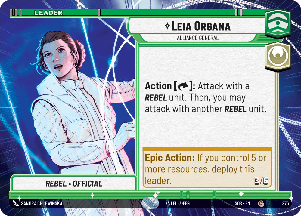 - No Real Leader Competition – Leia is a powerful leader, but her color and meta positioning makes it difficult for her to stand out amongst simpler, more direct leaders like Sabine or Kaz. As a rebel trait tempo deck that doesn’t include red, however, this niche is a perfect opportunity to get Leia back in the meta without hearing “why aren’t you just playing Sabine” every match.