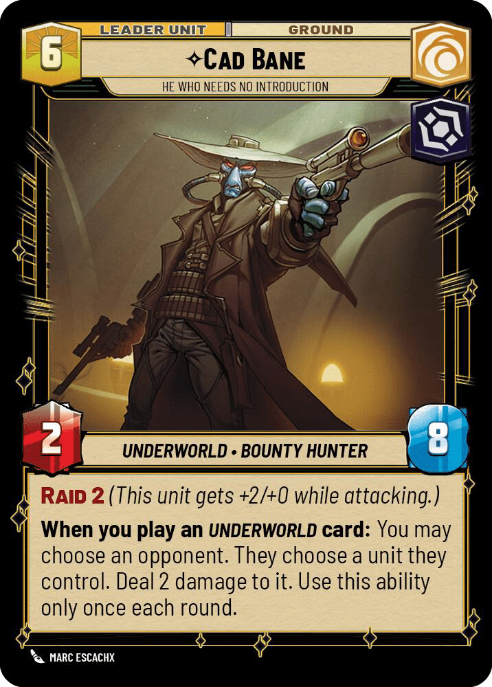 Lastly we reach the deploy, which is quite rough for Cassian. A 4/6 on 6 is definitely under-statted, with that stat line frequently showing up on faster 5 resource deploys. Saboteur helps Cassian a bit in that he can always hit base, but the ability to draw one card per turn without paying isn’t nearly a strong enough ability to make up for his late deploy and squishy stats. Even with powerful abilities and better stats, however, many 6 cost leaders struggle with the same fundamental problem as Cassian: at 6 resources, a leader deploy needs to be very high impact as both a leader and as a unit.