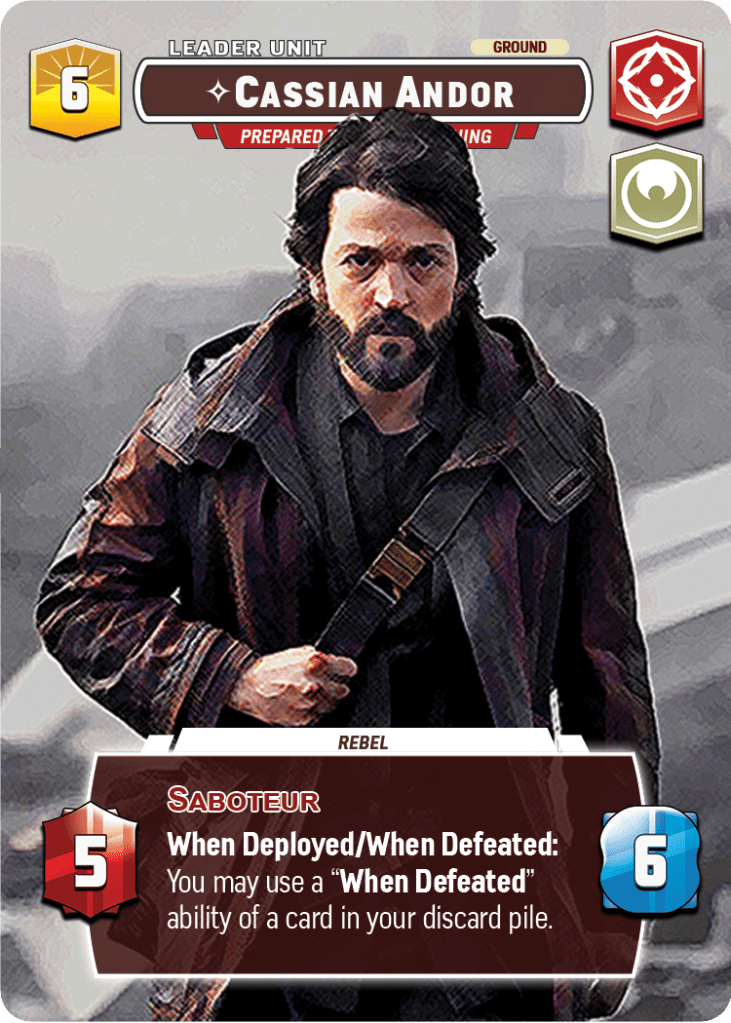 The unit side, on the other hand, is greatly changed. Instead of continuing to draw cards, which we may have done quite a bit by now, we’re going to get some immediate splashy impact by looking through our discard pile for a “When Defeated” ability. This ties nicely into his leader changes, which now let you load up your discard with relevant effects for the deploy, but it also provides extra synergies with the themed cards. Cassian can now use K-2SO’s “When Defeated” effect, he can tactically stack the discard with For A Cause I Believe In rather than saving it as a last second finisher, and he can really make the Heroic Sacrifice himself.