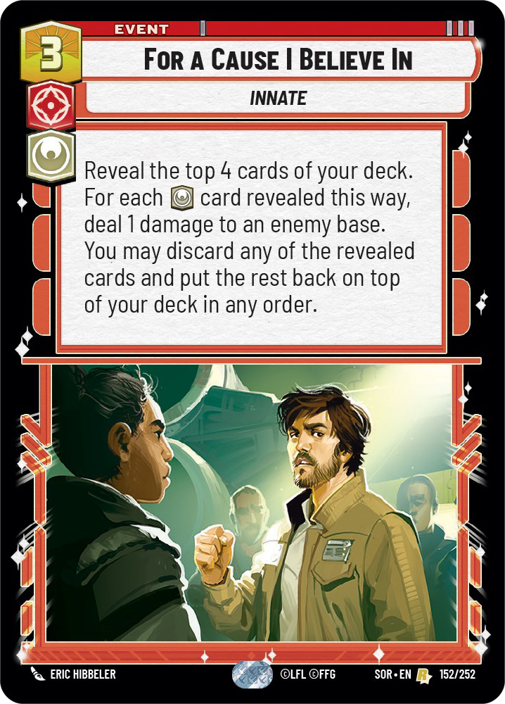 When it comes to themed cards and support, we do see a little bit for Cassian. He cares about dealing 3 damage each turn and having card advantage over your opponent, both of which are supported by the “When Defeated” effect on Cassian’s companion droid K-2SO. We also see For A Cause I Believe In, a direct damage event that can deal that important 3 damage from hand and set up your next draws. Heroic Sacrifice is also arguably included in this support in that it replaces itself in hand and makes any unit with at least 1 power deal 3 damage, but that’s a bit of a stretch – it’s more of a combo with K-2SO than it is with Cassian himself.