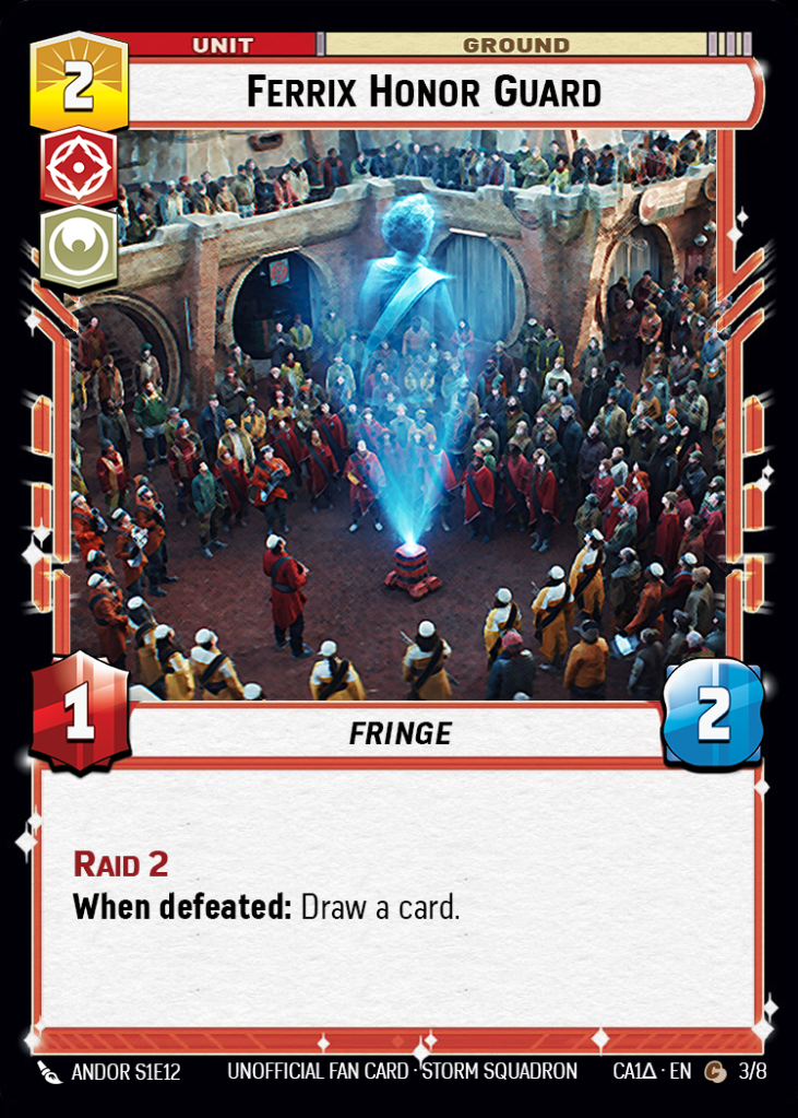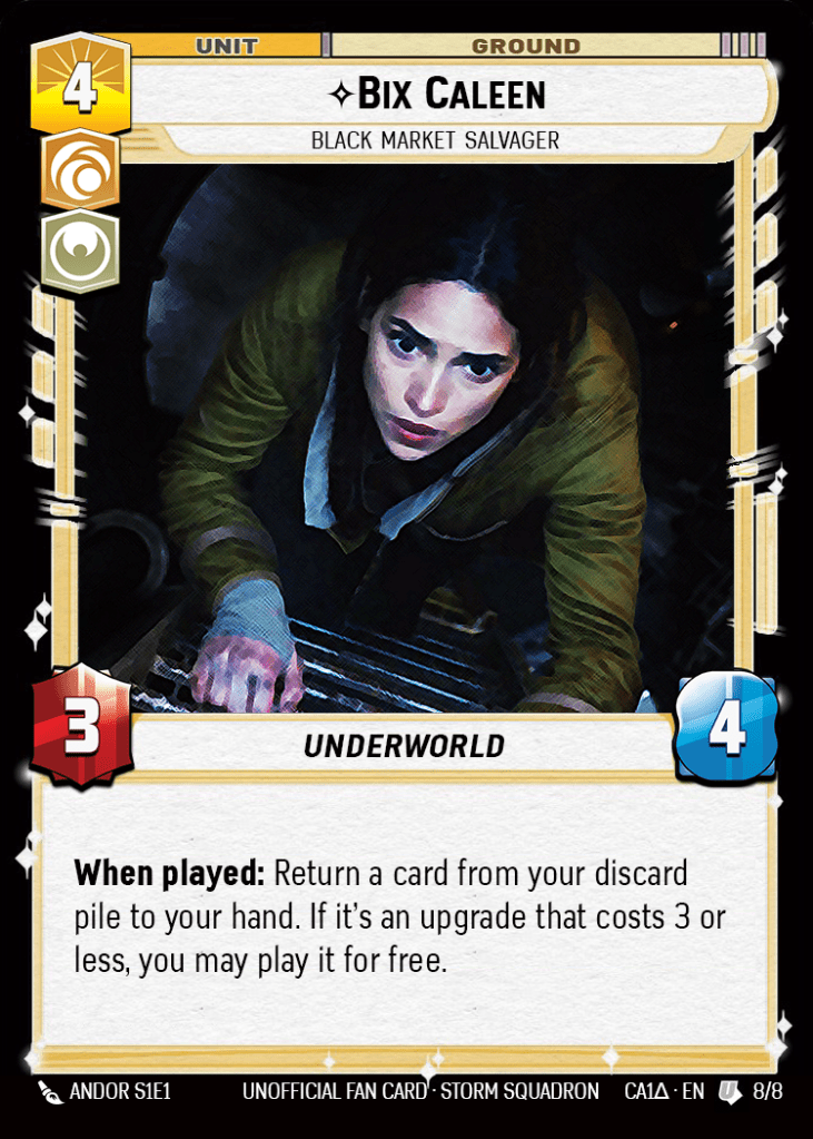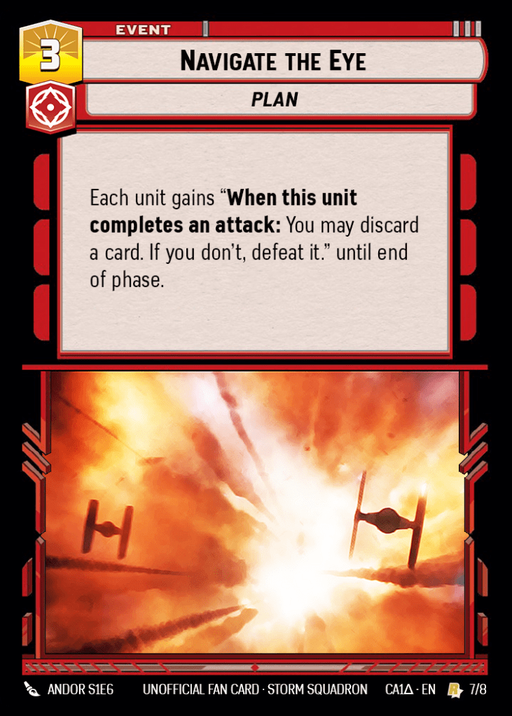 I’ll leave the act of digging through existing “When Defeated” effects to you, because I know that’s the fun part of a new leader reveal. But obviously I couldn’t just force this leader to exist in a vacuum, so here are a few other cards I’ve designed to work alongside this Cassian.