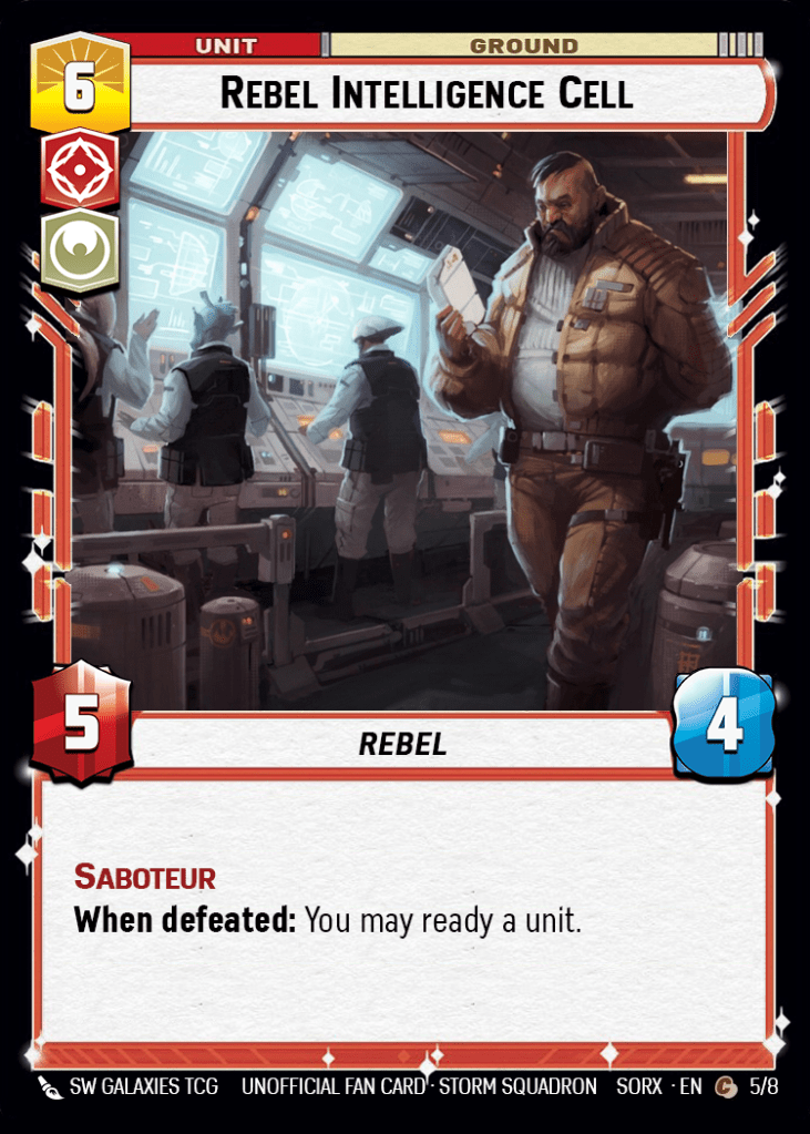 We of course keep the Saboteur keyword, which is flavorful, and we up his stats just a tad. Rather than the typical 4/7 statline of most 6 deploys, however, this Cassian is built as a 5/6 to get in, hit the base with one big strike, and then pressure your opponent into the relatively easy kill to give you the last piece of value (unless they’d prefer you keep hitting them).